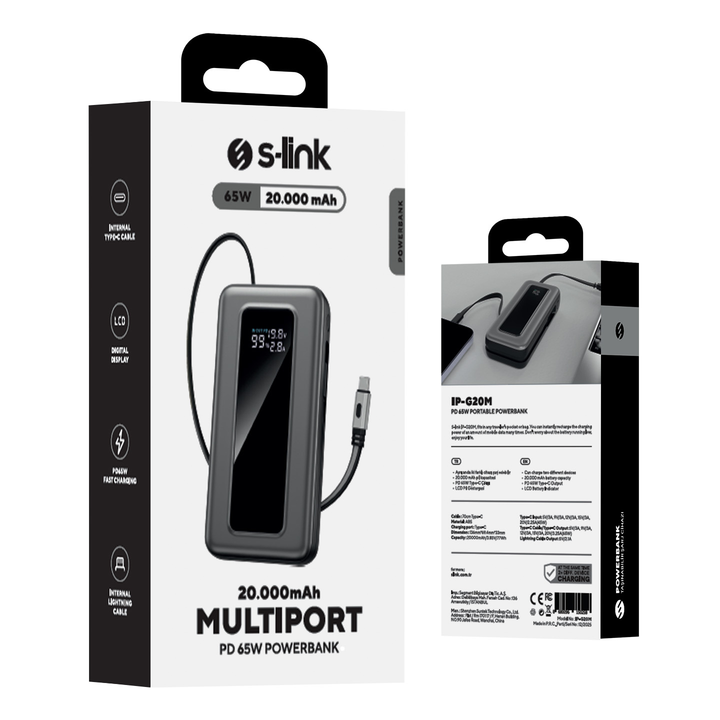 20000mAh PD22.5W Type-C+Lightning Kablolu Siyah LCD Taşınabilir Pil Şarj Cihazı Powerbank