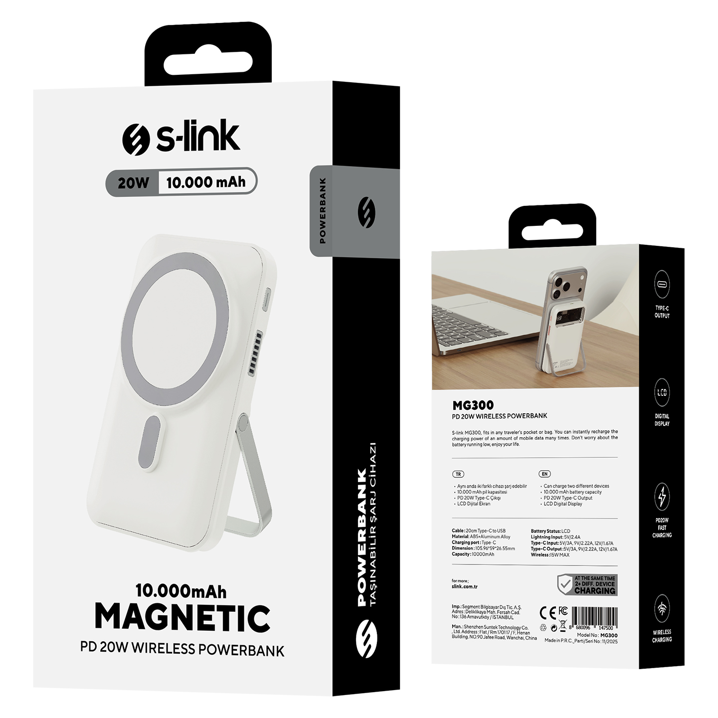 10000mAh PD20W Magsafe 15W Kablosuz Type-C Beyaz Taşınabilir Metal Şarj Cihazı Powerbank