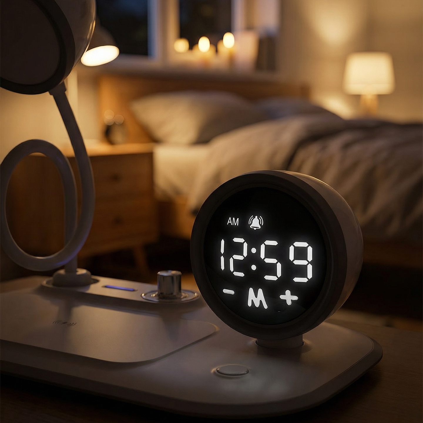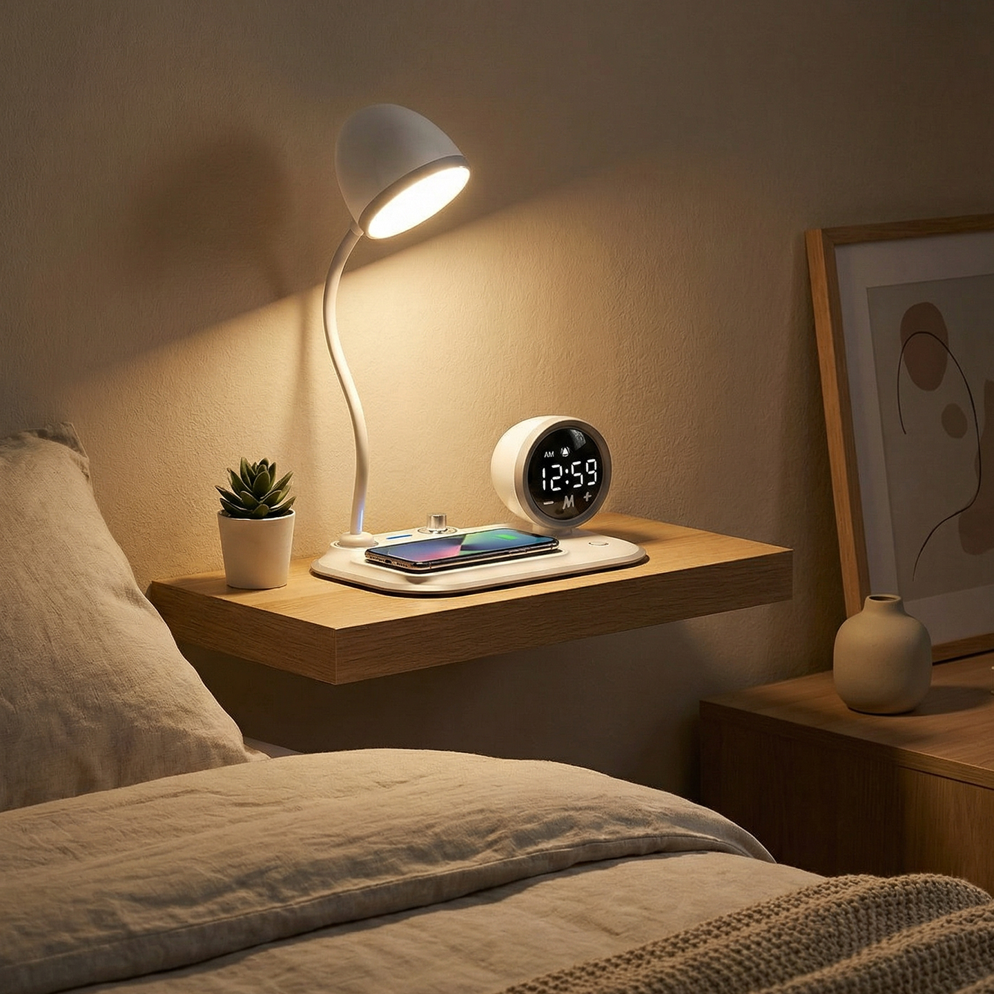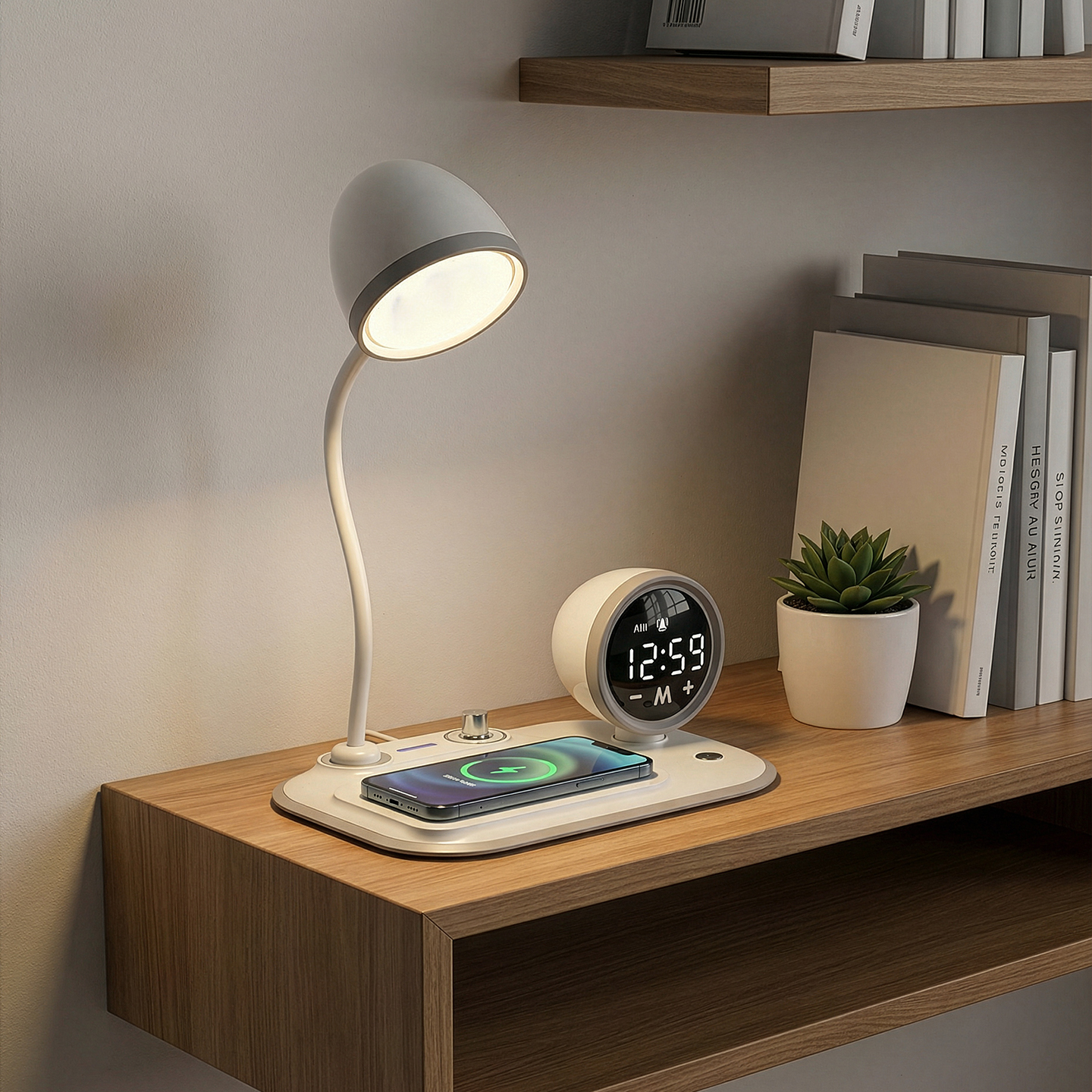 Telefon Uyumlu Fast Şarj 15W Ayarlanabilir Led Işıklı LCD Ekran Double Alarmli Beyaz Masa Lambası