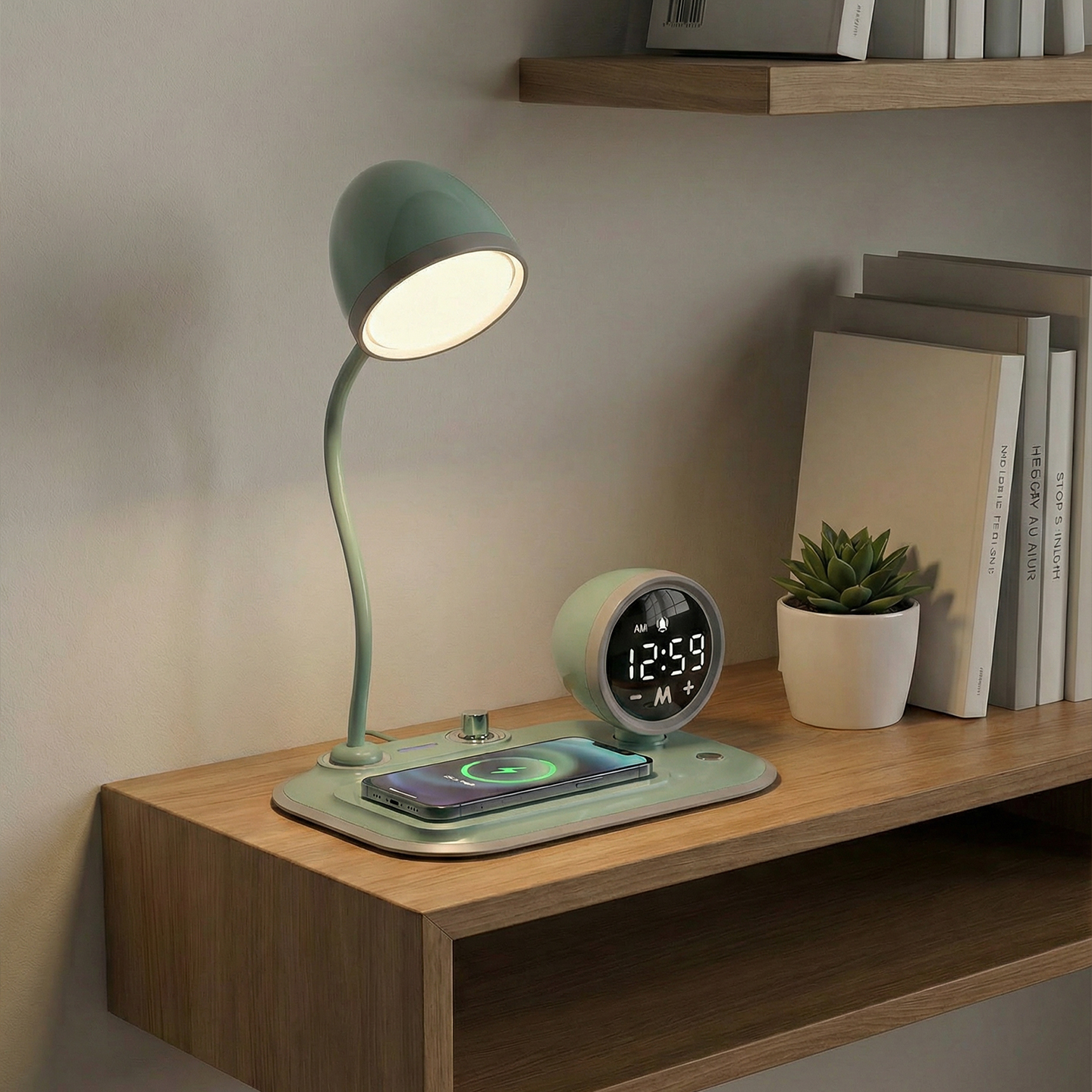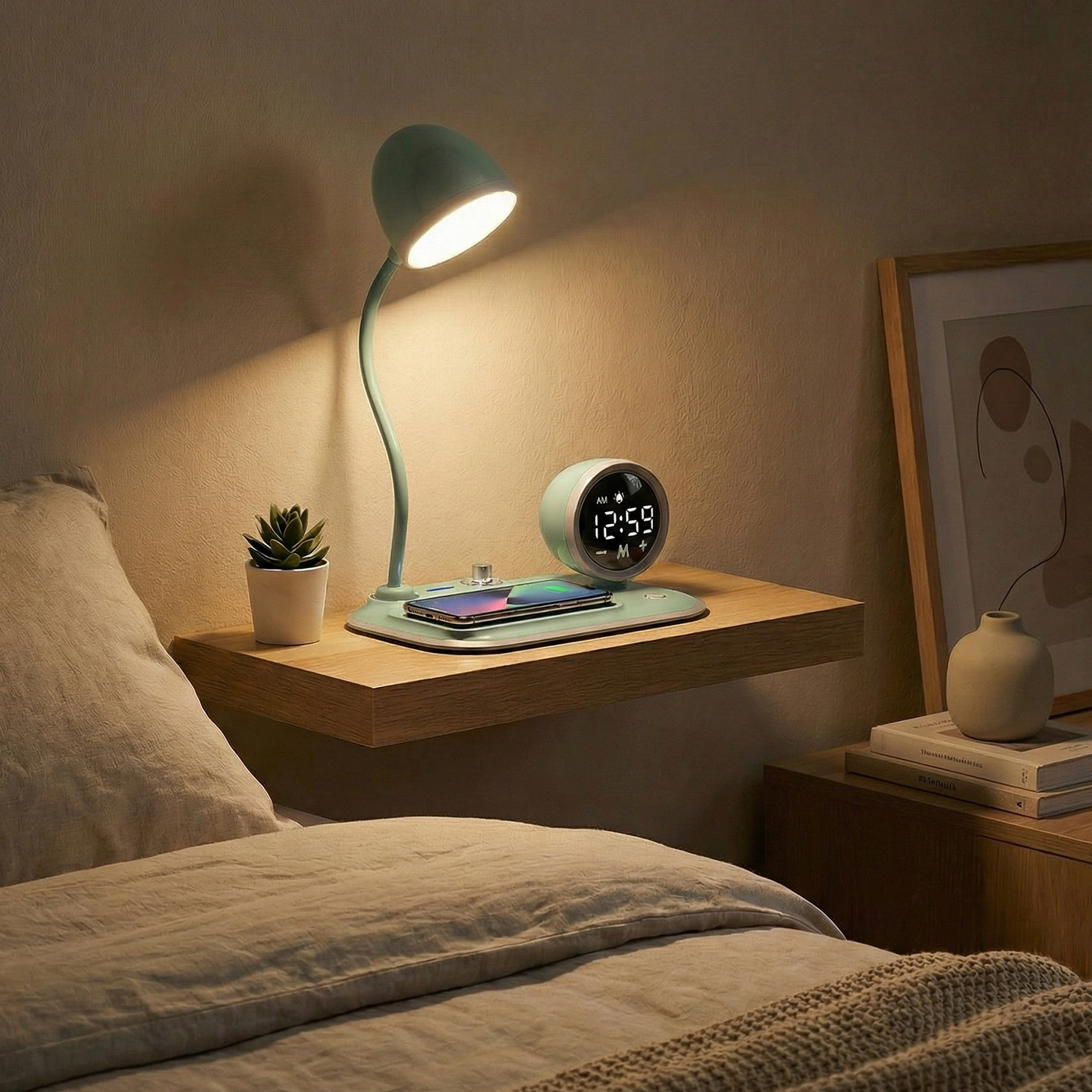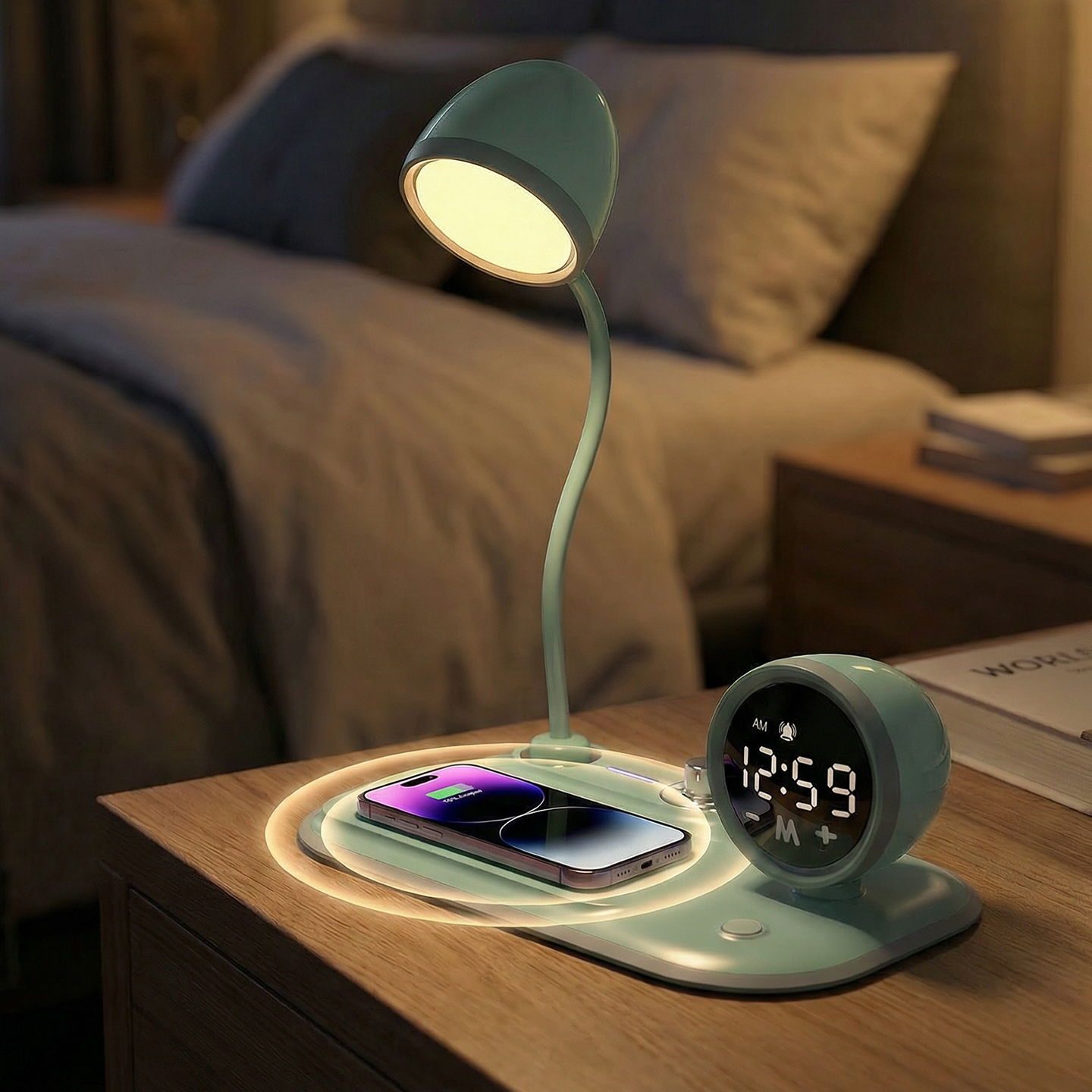 Telefon Uyumlu Fast Şarj 15W Ayarlanabilir Led Işıklı LCD Ekran Double Alarmli Beyaz Masa Lambası