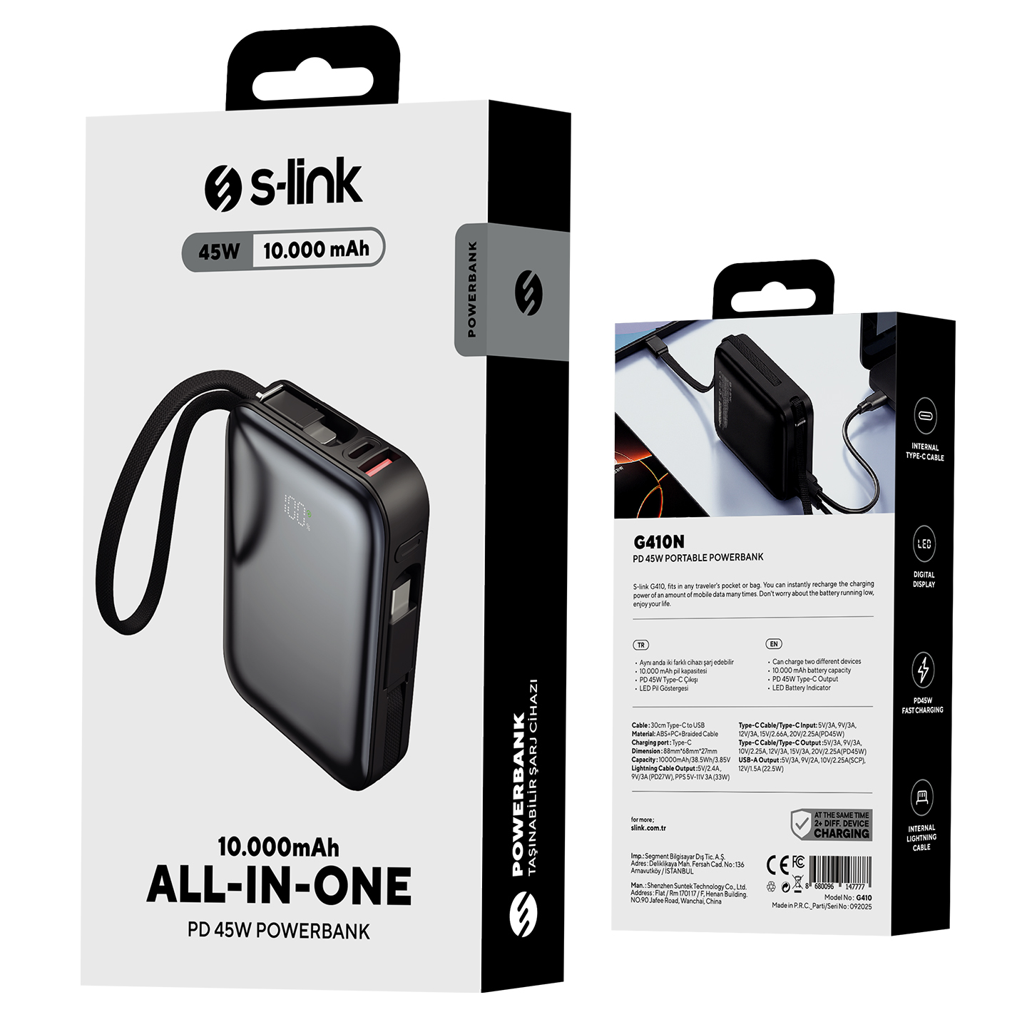 10000mAh PD45W Type-C+Lightning Kablolu Siyah LCD Taşınabilir Pil Şarj Cihazı Powerbank