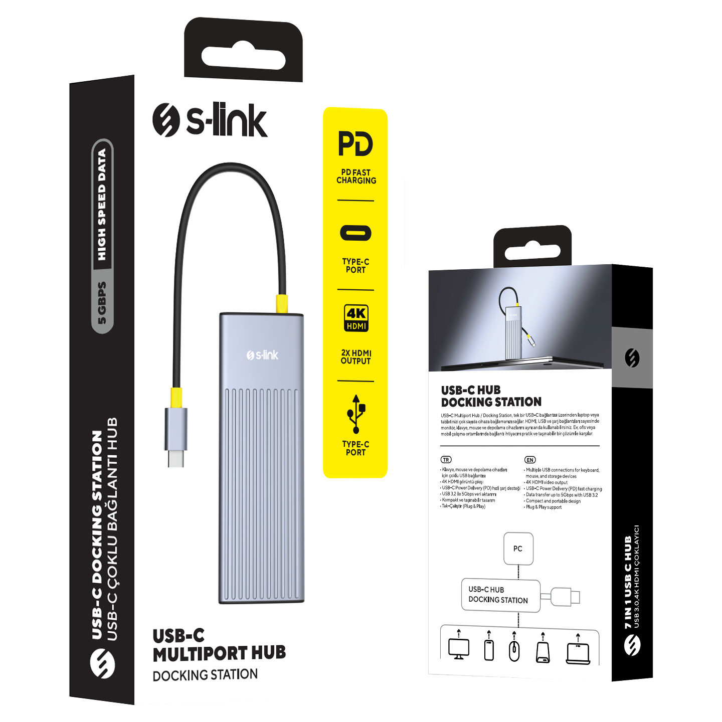 7 in 1 Gri Metal 4K 60Hz HDMI 100W PD, 2xUSB 3.2 1xType-C Data, SD/TF Type C Hub Adaptör
