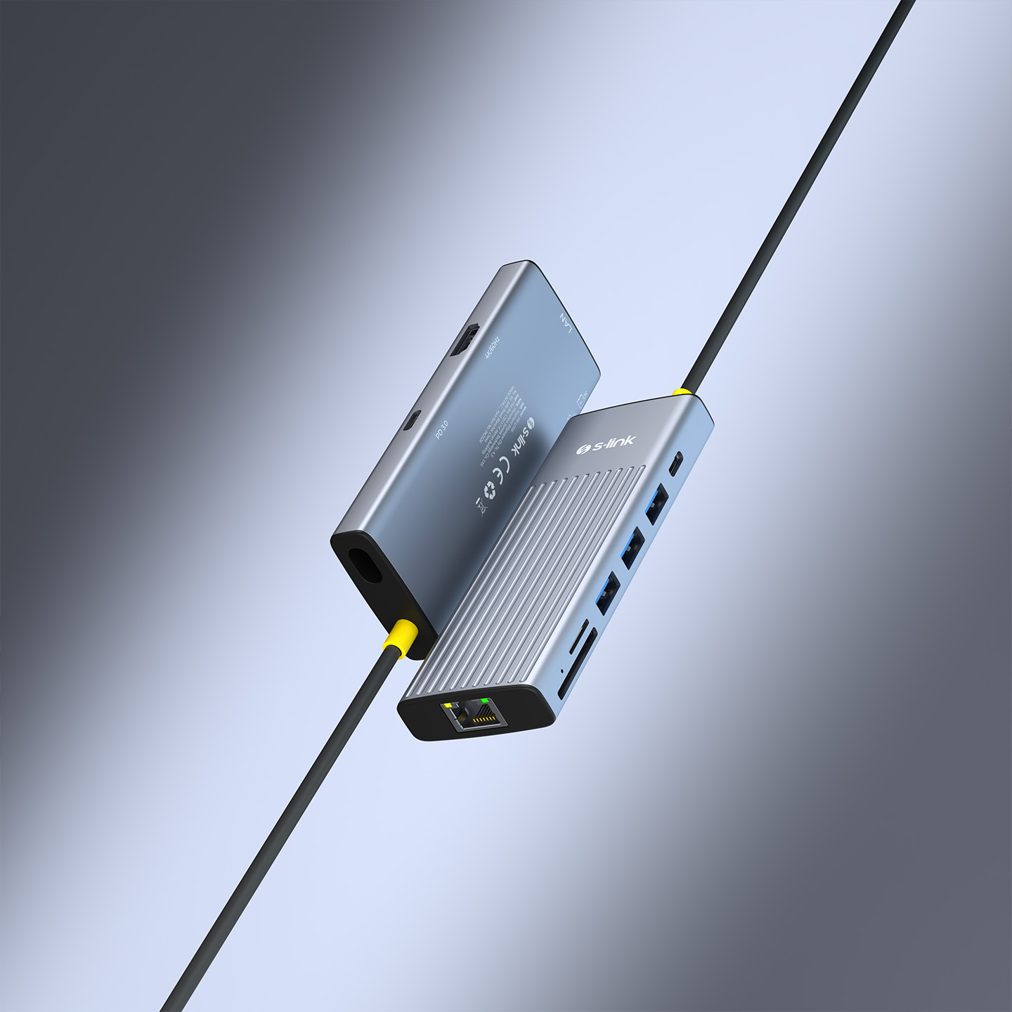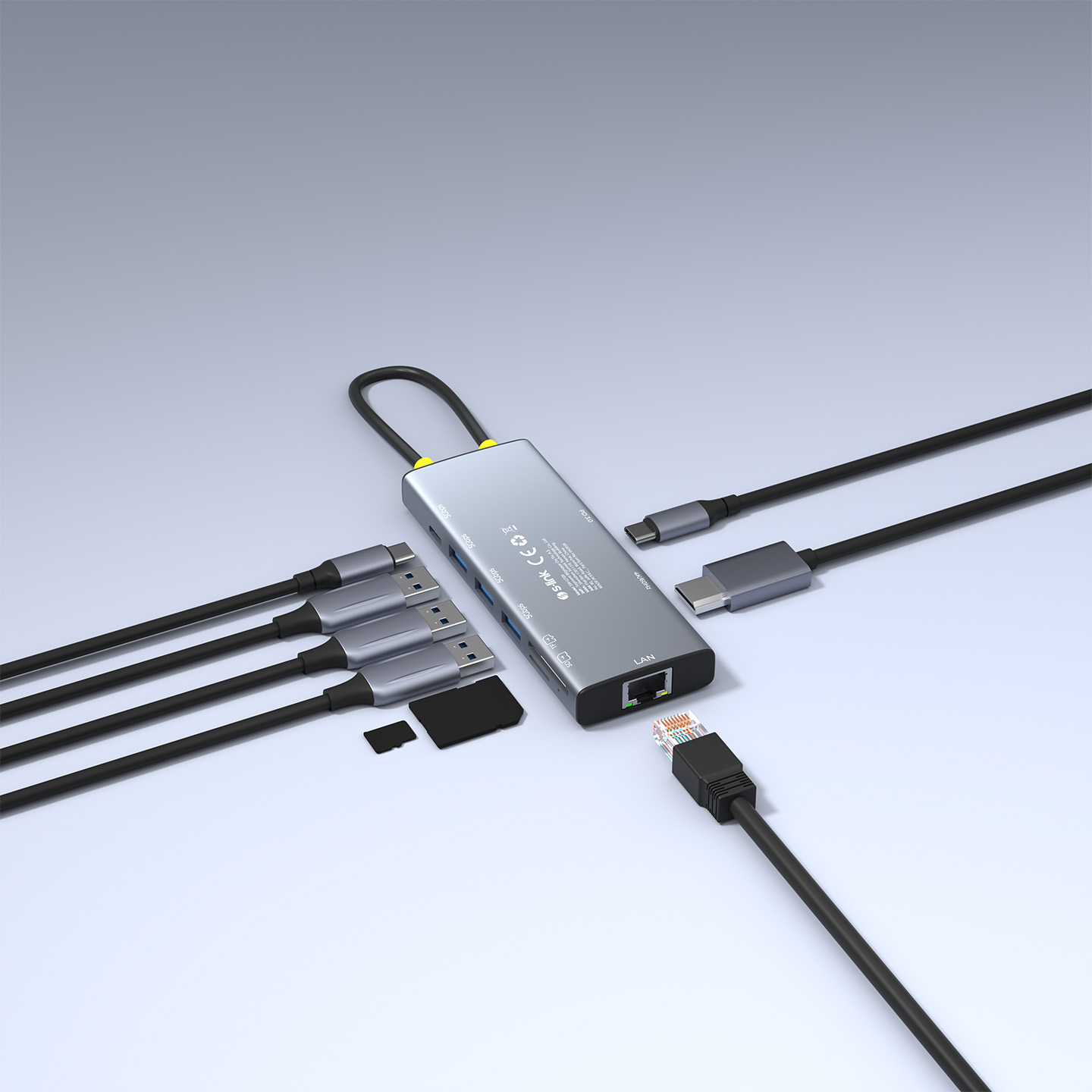 11 in 1 Gri Metal 2xHDMI 8K30Hz 100W PD, RJ45 Gigabit, 5xUSB-A, 2xType-C Data Type C Hub Adaptör